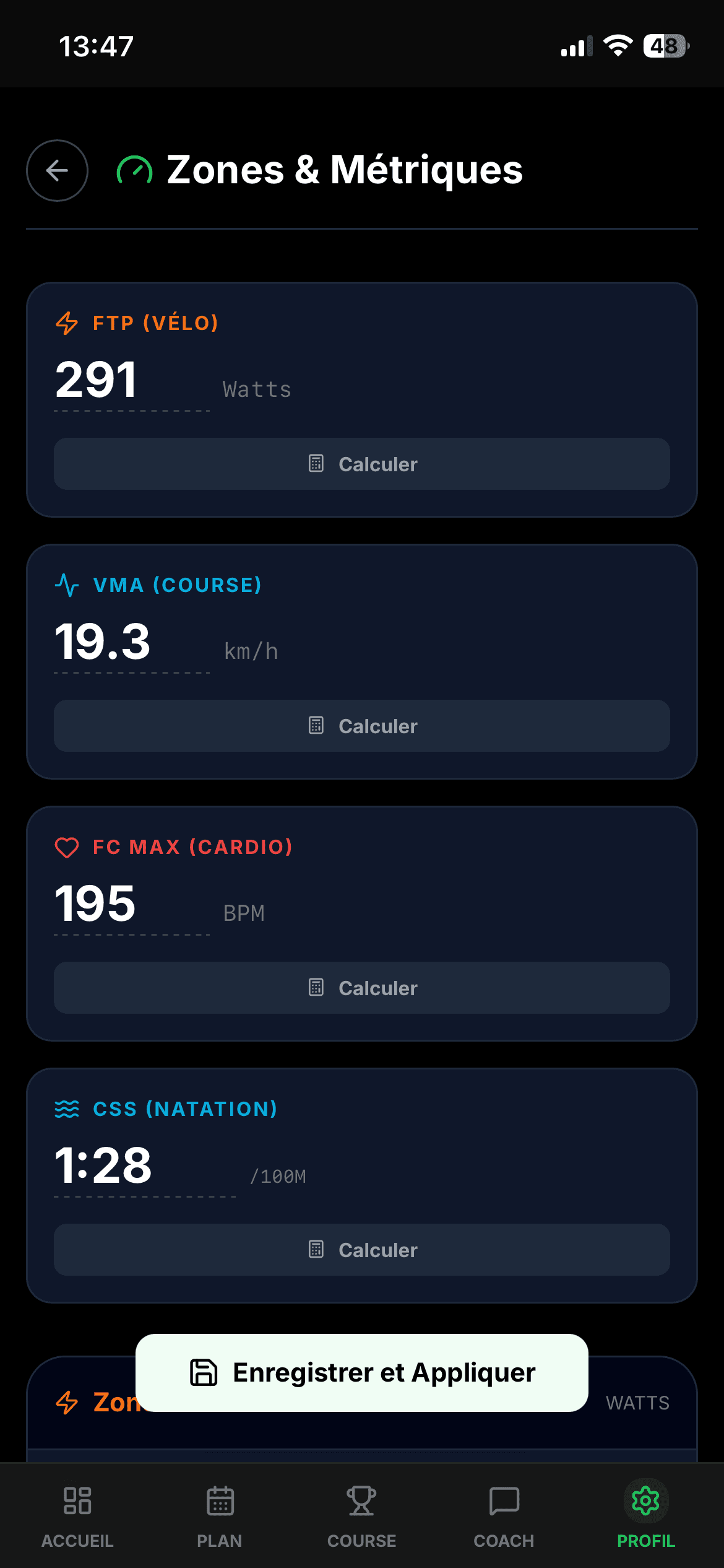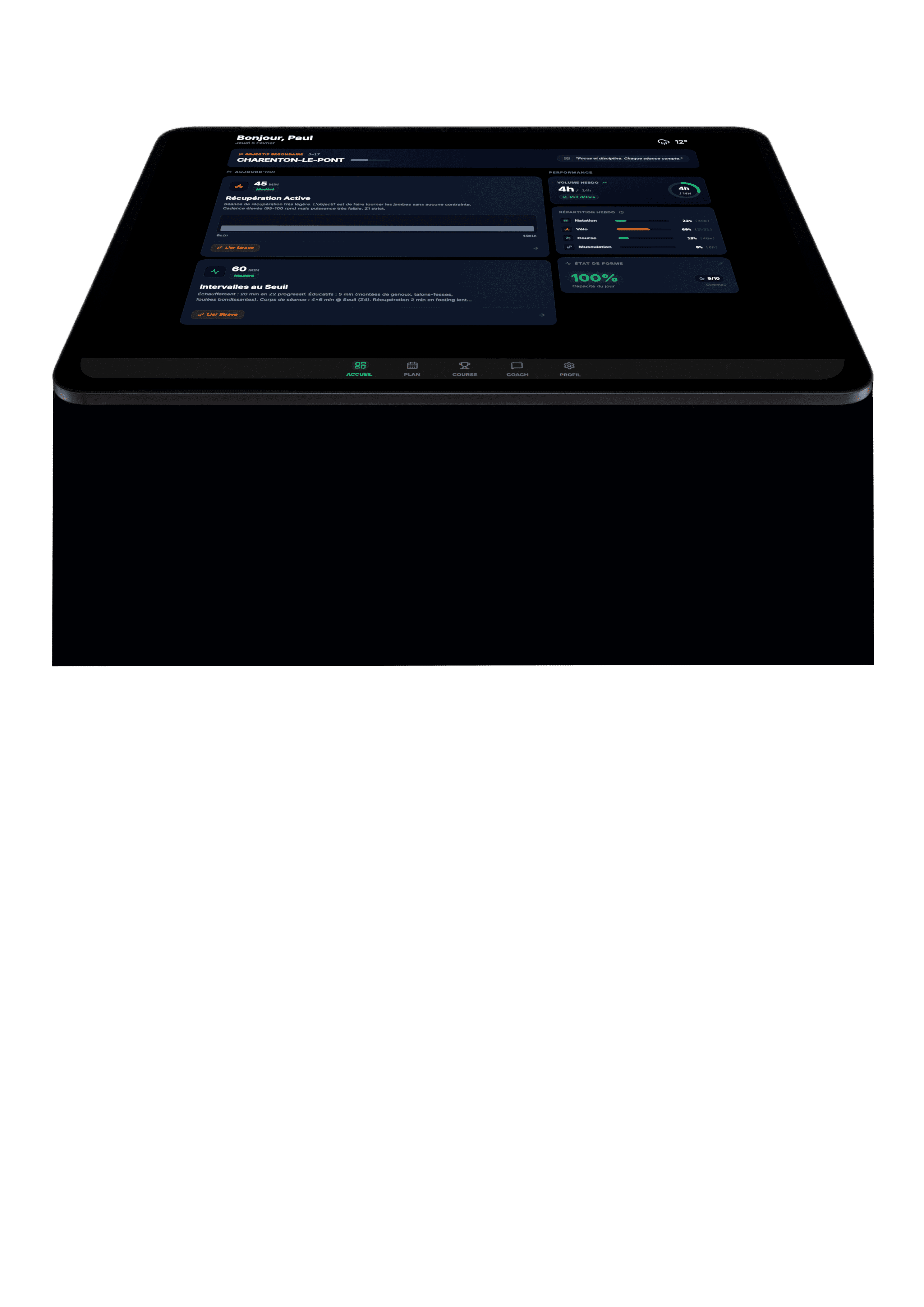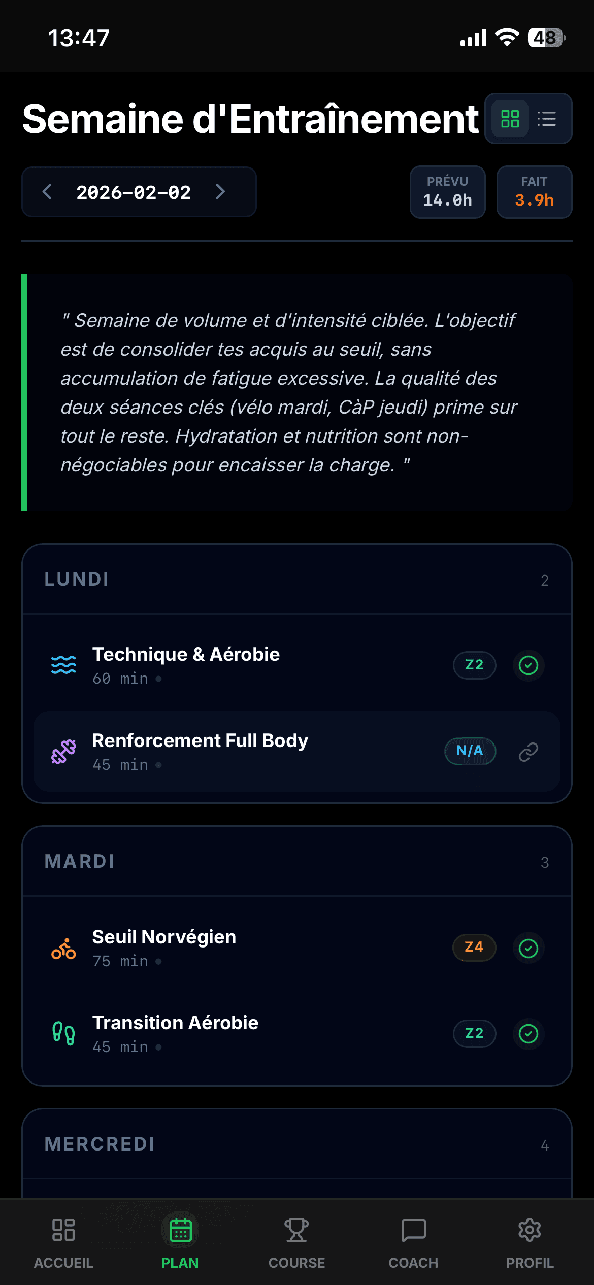 Nous ne voulions pas copier l'existant, mais le réinventer. Pensée par des sportifs pour des sportifs, notre approche est concrète : au réveil, vous savez exactement quoi faire, pourquoi le faire, et si la météo le permet. Une fois la séance finie, l'app analyse vos données pour adapter dynamiquement la suite.